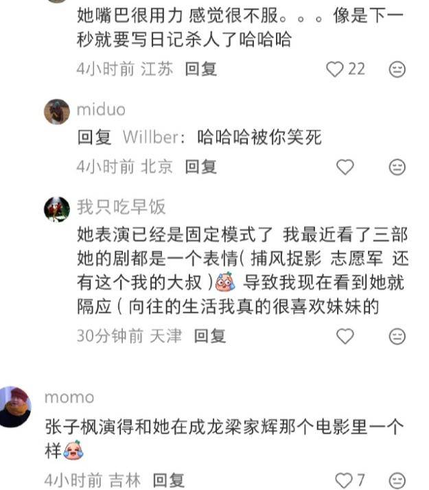 这两位85花可能是演戏演多了,已经疲惫了,才演不出层次感,可最近还有年轻的00花张子枫,也因为同样的原因遭到了大量诟病。