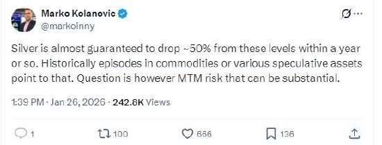 他周一在X网站上发帖称:“白银几乎肯定会在一年左右的时间里从目前的水平下跌约50%。历史上大宗商品或各种投机性资产的走势都预示着这一点。”