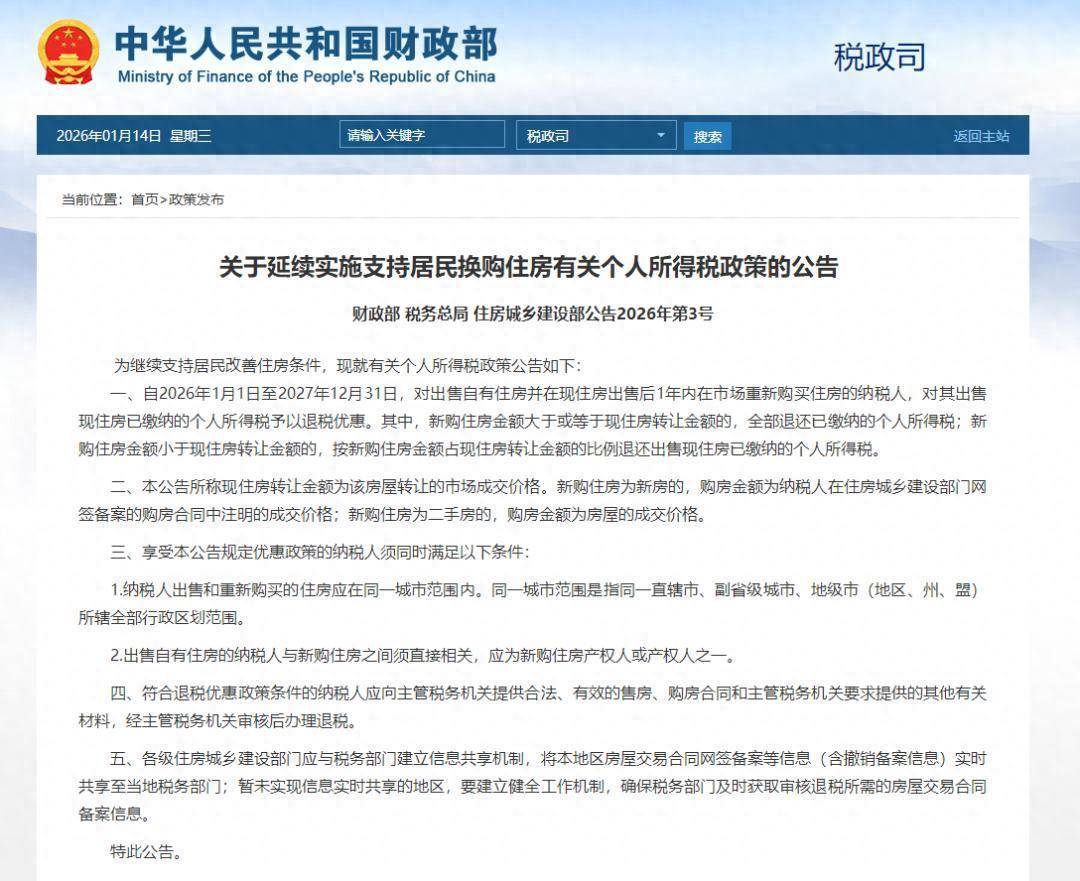 《公告》明确自2026年1月1日至2027年12月31日,对出售自有住房并在现住房出售后1年内在市场重新购买住房的纳税人,对其出售现住房已缴纳的个人所得税予以退税优惠。全文如下: